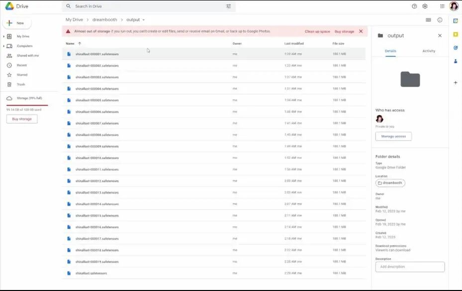如果你想知道自己的文件在哪里,进入Google Drive,你会在My Drive文件夹下看到Dreambooth文件夹,所有一切都应该在这里的output文件夹里。点开之后可以看到所有的回合结果,最后结果是没有数字的文件。
