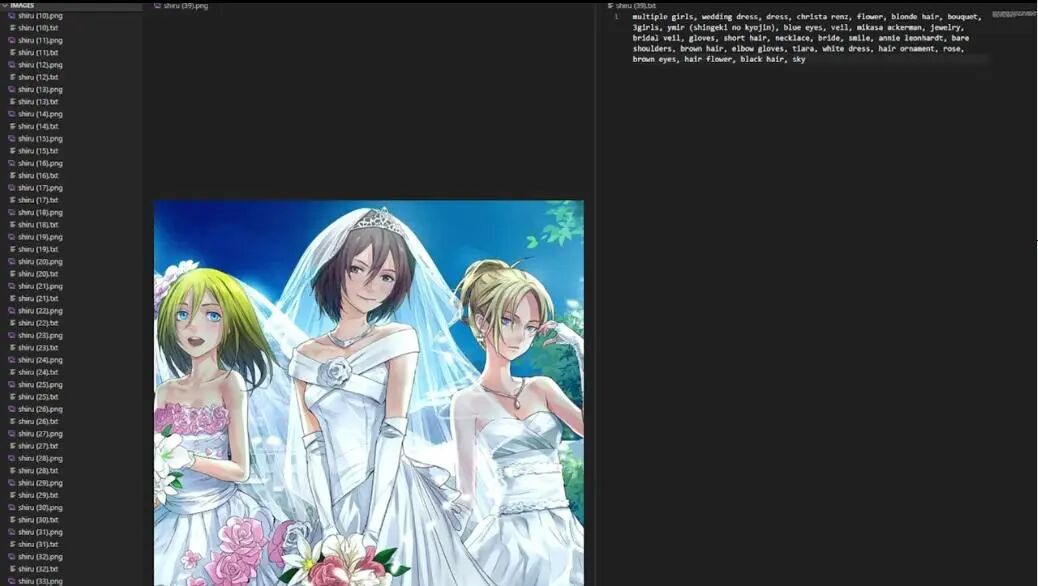 我不希望对每个细节都作出修改,但在这里有些东西是需要改变的,比如这里的角色描述是有名字参照的,如Mikasa Ackerman、Annie Leonhardt、Ymir(图片中并不存在),还有Christa Renz。这里的名字对我们来说是个问题,就像在第一部分说过的那样,我们希望描述的是所有我们希望改变的东西。如果将名字留下来,它就会作为一个记号,会影响LoRA最终的风格。