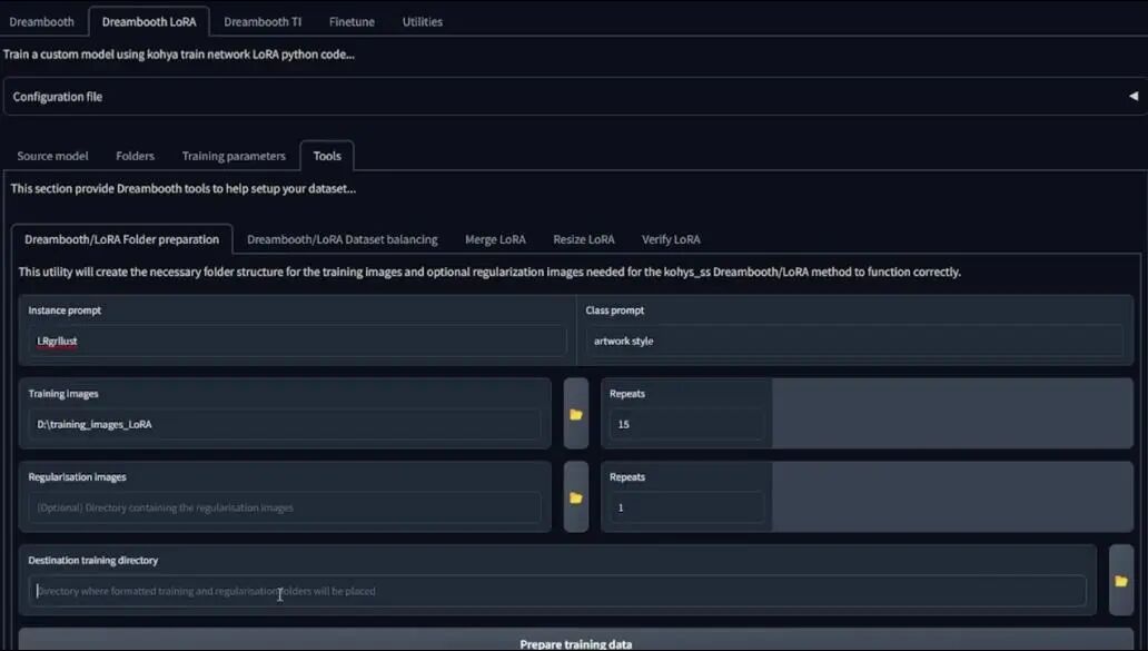 如果想要训练特定风格,你可以在这里增加前缀,比我们这里输入“VOFANstyle”,但我并不只是用它来训练这一位美术师的风格,所以我选择留空,这里是我选择的配置:
