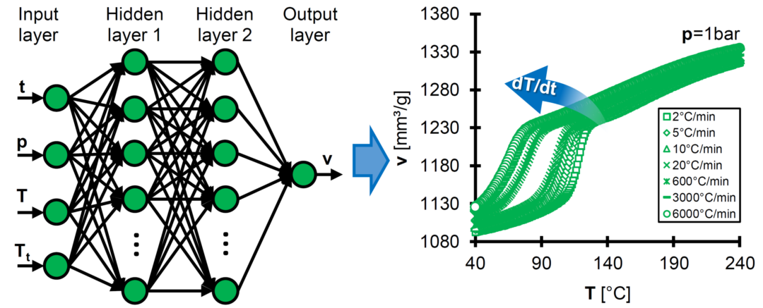 基于机器学习的人工神经网络(ANN)适应复杂非线性系统,在智能识别不可见因素方面具有优势,以此建立了具有实验范围外数据预测能力的ANN模型,预测了高速冷却条件下聚丙烯的比体积,适应实际注射成型过程。聚合物的比体积是一个关键参数,作为一种基本材料性质,它提供了许多非常有前途的应用。然而,通常作为压力(p)和温度(T)的函数的比体积(v)不能满足关于实验结果的精度要求。此外,聚合物制品成型过程是一个快速冷却过程,冷却速率(dT/dt)对聚合物的pvT行为有显著影响。然而,现今的商业测试设备无法获得高冷却率的pvT数据。因此,预测用于快速冷却应用的聚合物的比体积仍然是一个挑战。一些理论模型(如晶胞\晶格\空穴模型)只适用于描述聚合物液态pvT行为,且较复杂,难应用于实际生产。目前用于注射成型的pvT状态方程都是基于pvT测试实验数据的经验模型,如Tait和Schmidt模型。另外,常规pvT模型没有考虑冷却速率的显著影响,对制品收缩和翘曲的预测精度较低。注射成型过程中,模腔内聚合物温度变化差异很大,靠近模腔壁面的冷却速率可达3000°C/min,靠近制品中心的冷却速率也高达60°C/min。商用PVT测试仪仅能达到30°C/min,且高速冷却下的样品内部温度梯度很大,严重影响了测试精度。亟待构建考虑冷却速率影响的高精度pvT模型,预测实验无法测到的聚合物比体积及其随压力和温度的变化。新开发的连续双域pvT状态方程(EoS)通过添加冷却速率因子可以实现高冷却速率条件的聚合物比体积预测,但是模型的数据拟合和参数回归存在繁琐和不确定性,可能由于局部极小现象而无法获得最佳参数集。机器学习算法促进了通过数据驱动的聚合物科学,并有可能探索尚未发现的序列模式——过程依赖性。基于机器学习的人工神经网络(ANN)算法适应对复杂非线性系统建模,在智能识别不可见因素方面具有优势,但鲜有通过ANN预测聚合物pvT关系的报道。因为ANN可很容易实现数据范围内插值的良好预测,但对于超出训练数据极值的外推并不有效。由于商用pvT测试仪在高速冷却方面的局限性和低精度,通过ANN外推实验范围外的聚合物比体积是一个重大挑战。为此,构建了适用于聚合物pvT关系的ANN建模方法,成功实现了6000°C/min冷却速率条件下聚丙烯(PP)比体积的预测。这项工作涉及ANN在实验不确定性范围内对依赖于p、T和dT/dt的v进行建模的潜在应用。将半结晶PP在