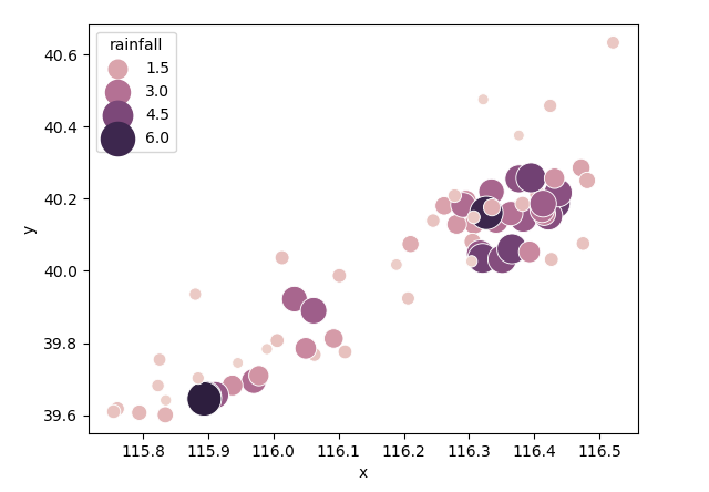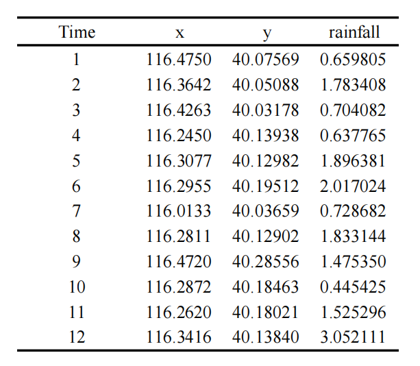 (2)降雨质心(可理解为场次降雨某个时刻的降雨中心)坐标,对应降雨时刻与雨强大小,具体如下表所示:首先利用降雨质心数据绘制气泡图: