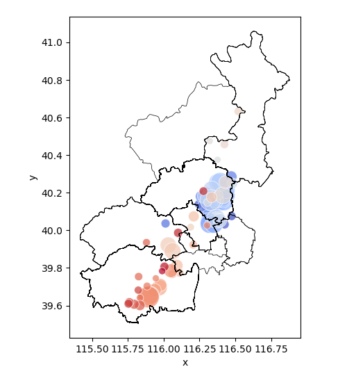 “为了保持原有的气泡图大小和颜色,并将它们绘制在提供的shp文件范围内,我们可以使用geopandas库。首先,我们需要导入所需的库和数据。”