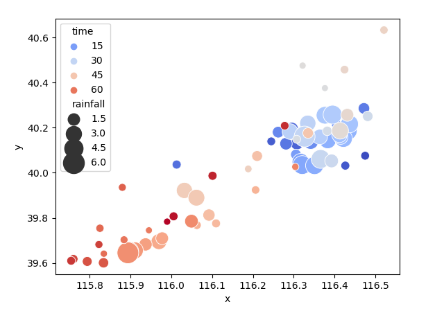 sns.scatterplot(x='x', y='y', data=data, hue='time', size='rainfall', sizes=(50, 500), palette='coolwarm', alpha=0.7, legend=False, ax=ax)