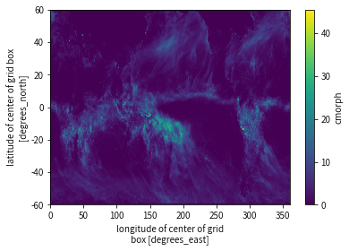 Dimensions: (time: 31, nv: 2, lat: 480, lon: 1440) Coordinates:time (time) datetime64[ns] 2008-01-01 2008-01-02 ... 2008-01-31 lat (lat) float32 -59.88 -59.62 -59.38 -59.12 ... 59.38 59.62 59.88 lon (lon) float32 0.125 0.375 0.625 0.875 ... 359.4 359.6 359.9 Dimensions without coordinates: nv Data variables: time_bounds (time, nv) datetime64[ns] dask.array lat_bounds (time, lat, nv) float32 dask.array lon_bounds (time, lon, nv) float32 dask.array cmorph (time, lat, lon) float32 dask.array Attributes: (12/57) ncei_template_version: NCEI_NetCDF_Grid_template_V2.0 title: NOAA Climate Data Record (CDR) of CPC Morphin... keywords: Precipitation, Satellite, High-Resolution, Gl... summary: The CMORPH CDR is a reprocessed and bias-corr... references: Xie, P., et al. (2017), Reprocessed, Bias-Cor... Conventions: CF-1.6, ACDD-1.3 ... ... geospatial_lat_resolution: 0.25 geospatial_lat_units: degrees_north geospatial_lon_min: 0.0 geospatial_lon_max: 360.0 geospatial_lon_resolution: 0.25 geospatial_lon_units: degrees_east # 2008年1月平均降雨量 ds.cmorph.mean(dim='time' ).plot()