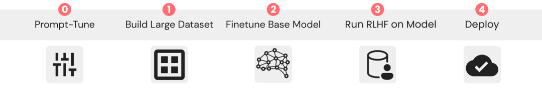 基础模型能理解一般的英语,但如果需要它们学习一些垂直语言和规则,prompt微调并不足够,很多时候我们都需要构建自己的LLM。利用用下面这个步骤,就能获得像ChatGPT一样遵循指令的LLM。- 尝试prompt-tuning ChatGPT或其他模型