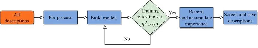 如图2所示,课题组基于以下策略对4885个分子结构描述符进行特征筛选:所有经过预处理的特征,包括去除空值、异常值、重复项和低方差特征,用于构建GBRT模型,75%用于训练,25%用于测试。当训练集和测试集R2 > 0.3时,记录并累加该模型中每个特征的重要性,直到400次循环。最终根据特征重要性排序,小分子供体模型保留了前5个特征,聚合物供体模型保留了前6个特征。
