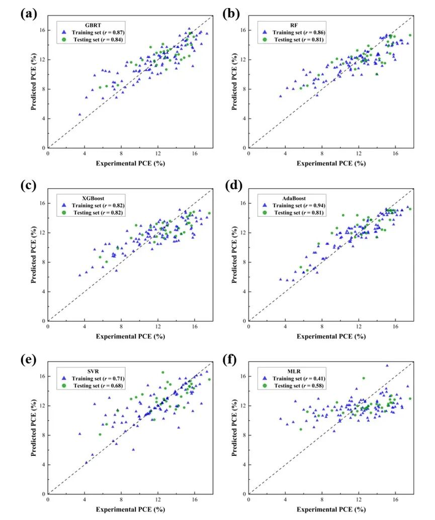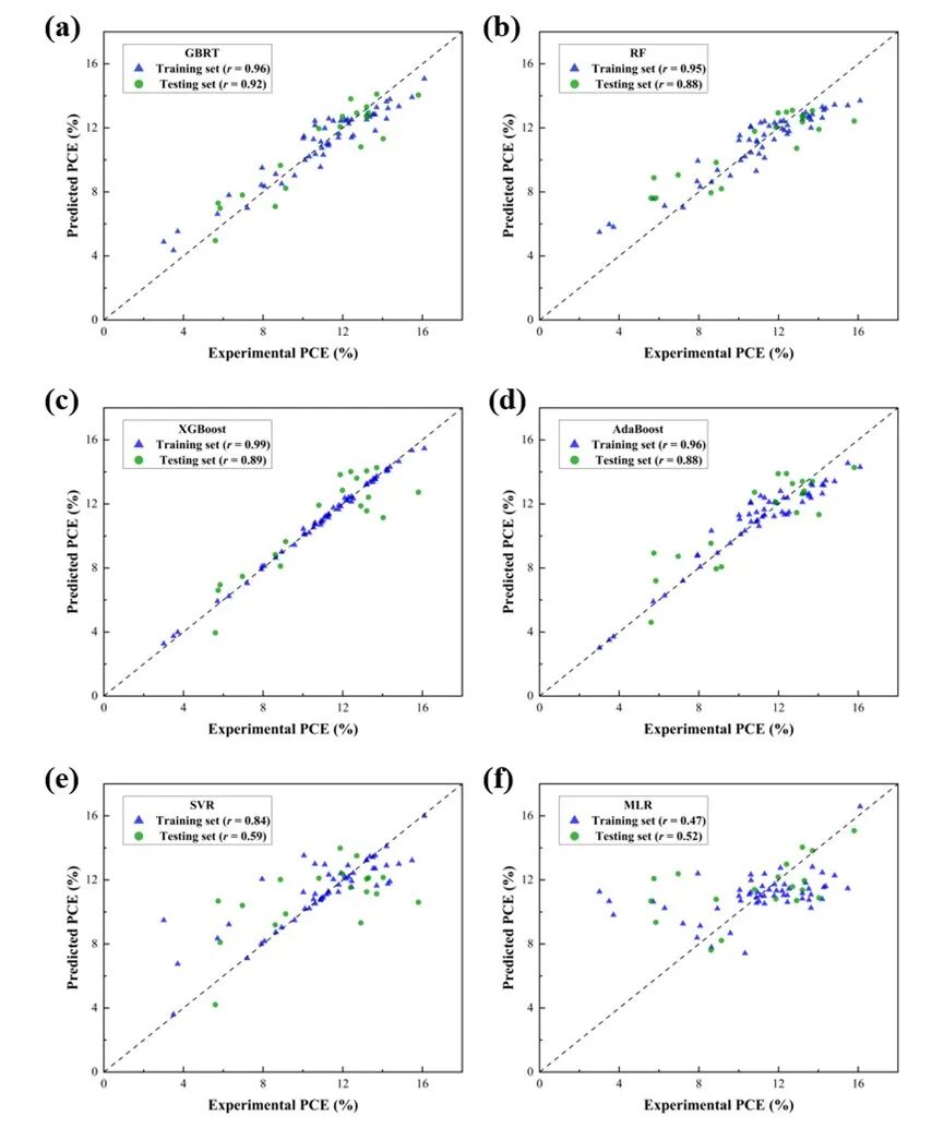 根据以上策略筛选的特征用于构建以下6种ML模型:GBRT、随机森林(RF)、极限梯度增强(XGBoost)、自适应增强(AdaBoost)、支持向量回归(SVR)和多元性性回归(MLR)。模型的训练和预测结果如图3和4所示。其中,GBRT模型体现了较低的RMSE和较高的r值,表明GBRT模型在预测器件性能方面具有较高的准确性和可靠性。