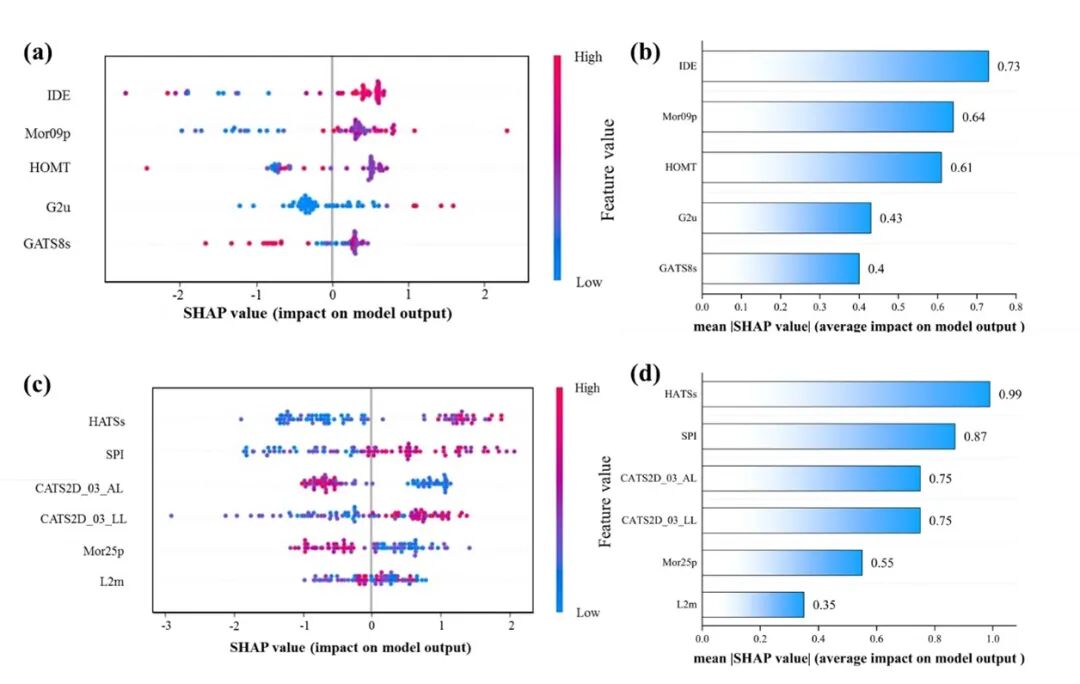图5. GBRT模型的SHAP分析。(a) (b) 基于小分子供体;(c) (d) 基于聚合物供体。
