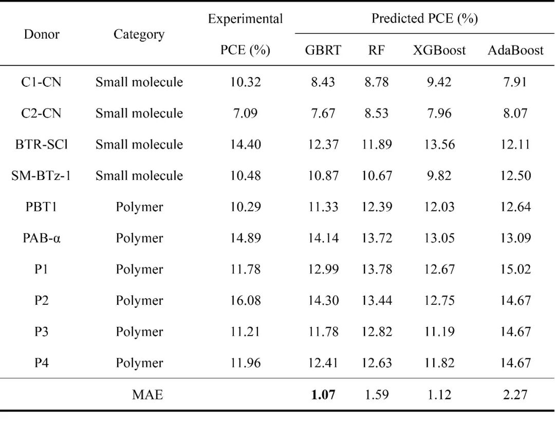 为了验证模型的预测能力,在模型构建后又收集了4个小分子供体和6个聚合物供体的新数据,并在性能良好的基于决策树的模型中运行,如表1所示。结果表明,这些模型的预测PCE与实验PCE具有较好的一致性,特别是GBRT模型的MAE值最小,且表现非常一致。这证明了这些模型具有良好的预测能力和鲁棒性。