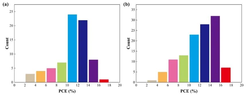 图1. 基于Y6受体的二元OSCs分布直方图。(a) 小分子供体,(b) 聚合物供体。