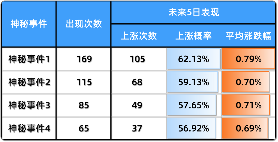 这里就有一个神秘征兆,只要这些征兆发生,大盘未来5日会有较大的概率上涨。具体统计如下表: