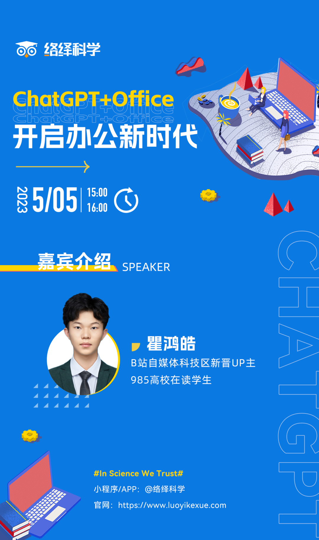 作为把我们推向人工智能时代的一款划时代的产品,ChatGPT 极大地提升了我们的工作、学习效率,为生产、生活带来了新范式。为了让人工智能真正赋能我们每个人的工作、学习与生活,真正践行 AI for Science,络绎科学推出【AIGC 应用实操】系列线上直播活动,邀请到人工智能领域产学研端的自媒体新秀、产品经理等从业者,从实际应用角度讲解如何让 ChatGPT 赋能我们的生产、生活。第一期实操直播活动,络绎科学邀请到 B 站自媒体科技区新晋 UP 主、某 985 高校数学与应用数学(统计学)专业的瞿鸿皓,以「ChatGPT+Office,开启办公新时代」为主题,分享如何在办公软件中灵活运用 ChatGPT,提高办公效率、获得灵感加成。