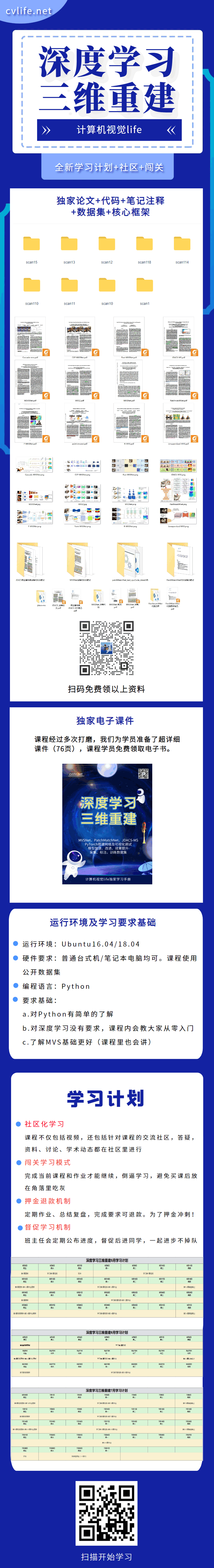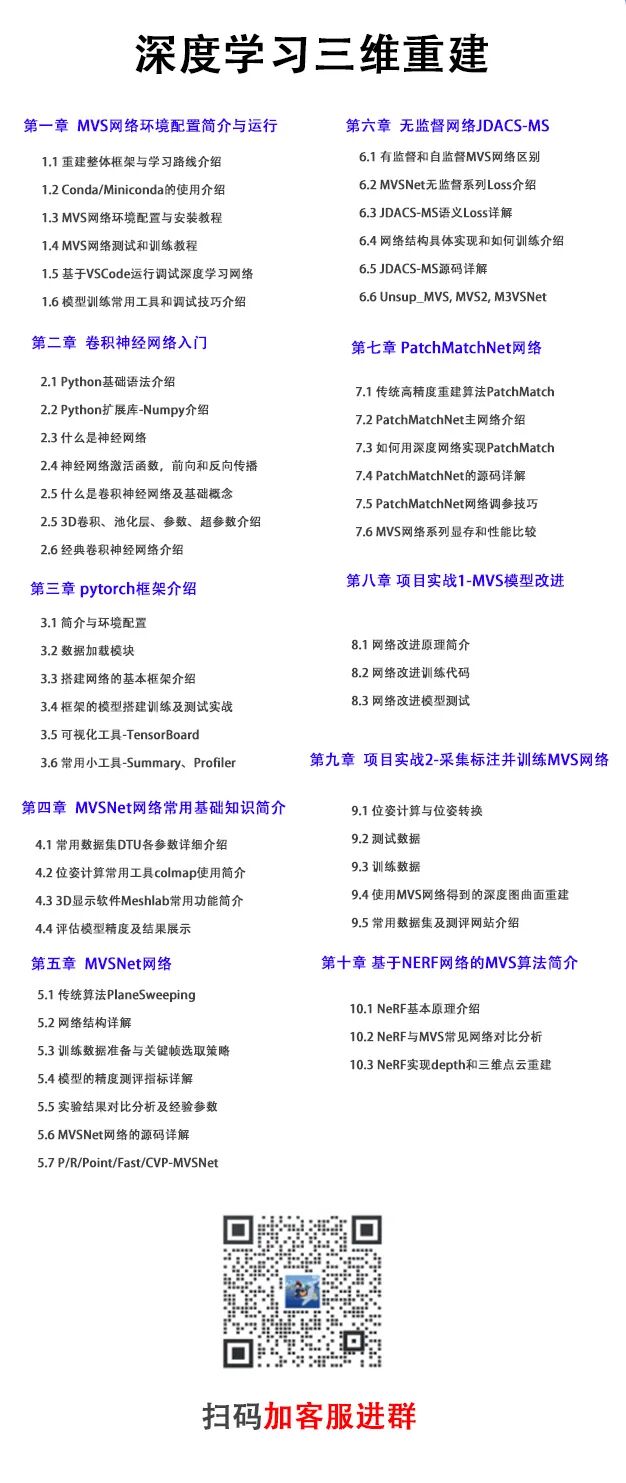 计算机视觉life推出了第3期《深度学习三维重建:从 理论到实战》,在前一期基础上增加了不少新内容,以深度学习MVS网络演化图为主线,覆盖目前深度学习MVS最前沿、最优秀的技术。理论与实战并重。这次我们采用挑战赛 + 闯关 + 押金的学习方式,高效率刺激的3个月学习计划如下