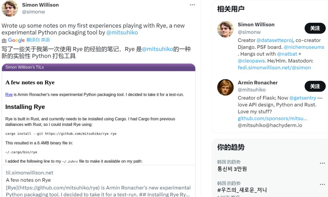 https://www.youtube.com/watch?v=CyI8TBuKPF0Rye 的超高人气引起了另一位大佬的关注,Django 创始人 Simon Willison 在体验 Rye 后写了一篇简单的使用指南,点此查看详情: