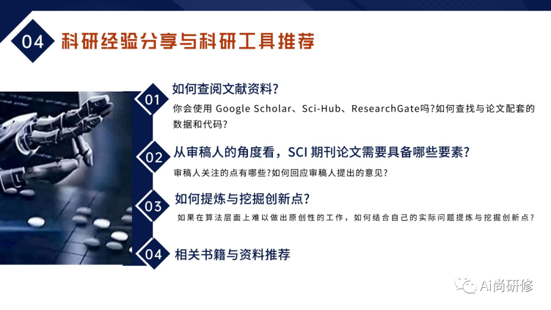NO4:Ai尚研修建立了长期免费学术讲座:聚焦基础原理、前沿热点技术、庖丁解文、实践技术、成果推广等专题,每月4期左右,已开展完200+期,上平台都可以免费观看前期讲座。