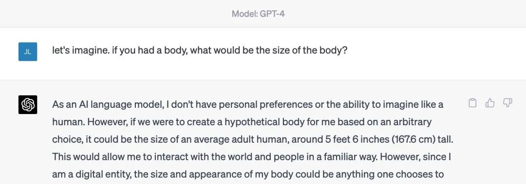 但是,当我们去问只「读万卷书」语言模型,ChatGPT(GPT-4),它是否有身体时,它回答说:「It could be the size of an average adult human, around 5 feet 6 inches (167.6 cm) tall. This would allow me to interact with the world and people in a familiar way.」