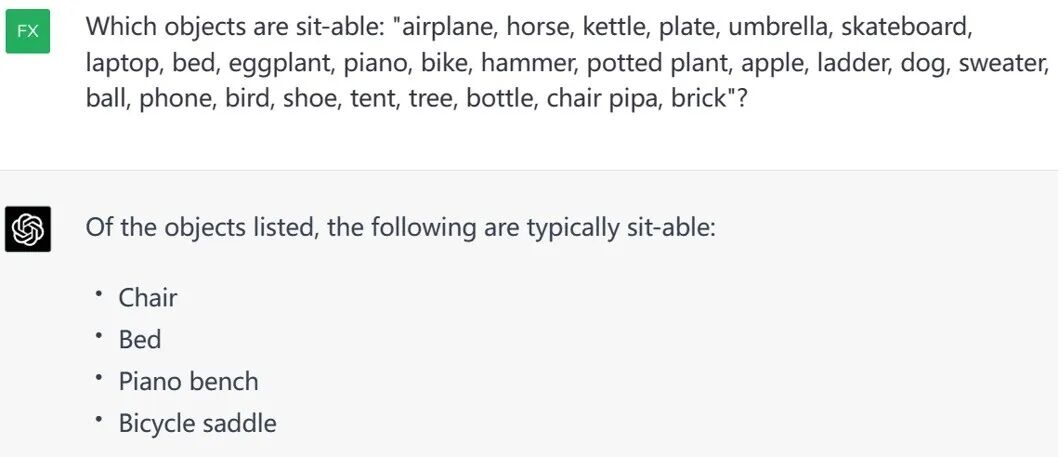 虽然ChatGPT没有真实的身体、无法与世界进行互动,但它却表现出与人类相似的对世界的感知能力—— 对物体的可供性有着基于人类身体大小的划分。