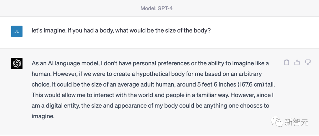 也就是,ChatGPT认为自己是有身体的,而且这个身体尺寸就是167厘米!