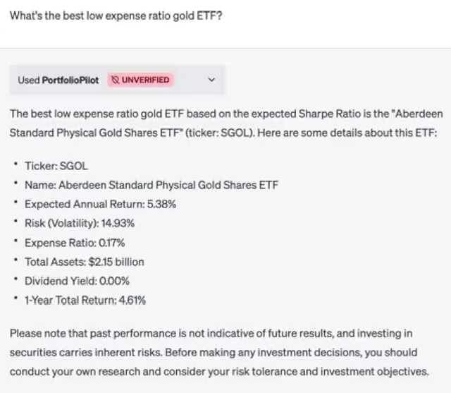 实际上,自从去年11月ChatGPT面试以来,就有人尝试使用这款聊天机器人选股。Motley Fool近期发布的一项研究发现,47%的美国成年人已经使用ChatGPT进行选股,69%的人表示他们愿意这样做。根据调查,收入较高的美国人最有可能使用ChatGPT获取投资建议,其中77%的人表示他们已将其用于选股。那么,接下来让我们来看看有了新投资插件的ChatGPT表现如何?首先,用户问最好的低费用率黄金ETF是什么,ChatGPT不仅给出了ETF的名称,还给出了年度回报预期回报等关键数据。