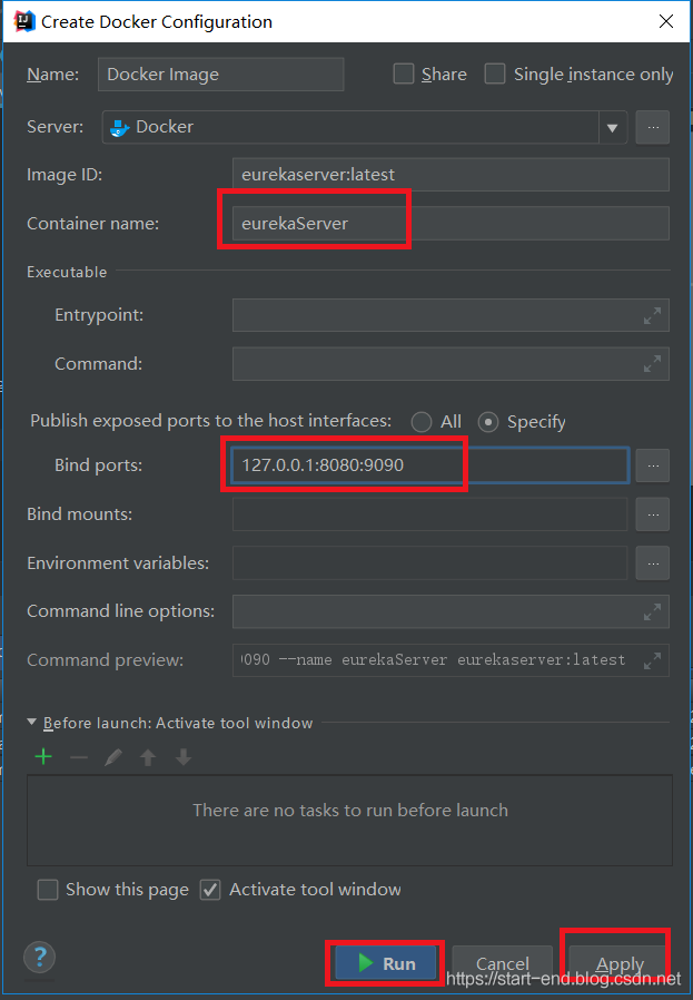 在Create Docker Configuration弹窗中修改Container name(容器名称) Bind ports(Ip和端口映射)
