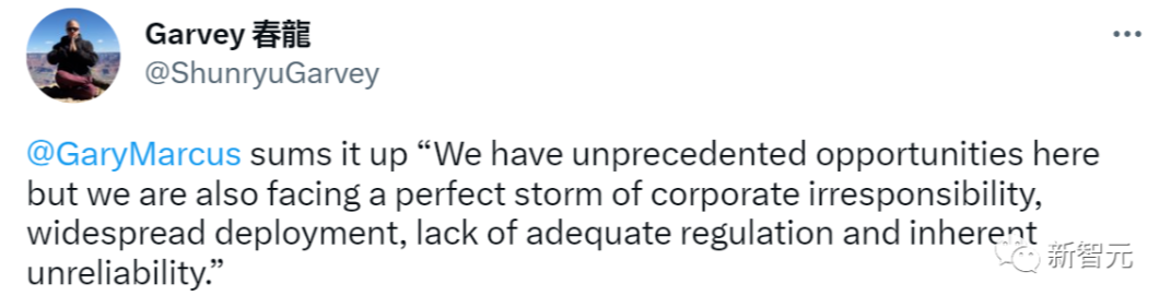 马库斯总结道:我们拥有前所未有的机会,但我们也面临着企业不负责任、广泛部署、缺乏适当监管和不可靠的可怕风险曾经微软的必应AI悉尼,表现出了一系列令人震惊的行为。「悉尼的问题很大,如果是我,会马上把它从市场上撤下,但微软并没有。」马库斯表示,这件事给自己敲响了警钟——即使是像OpenAI这样的非盈利组织,也可能被大公司买下,然后想做什么就做什么。但现在,人们的观点和生活都在潜移默化地被AI塑造和改变,如果有人故意利用AI技术,用于不良的目的呢?