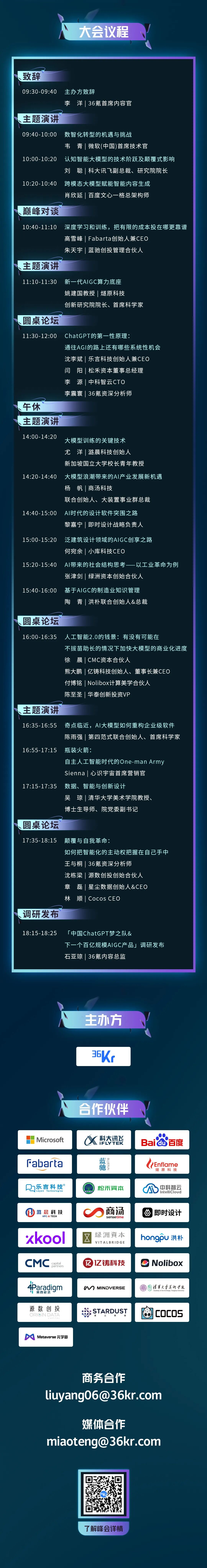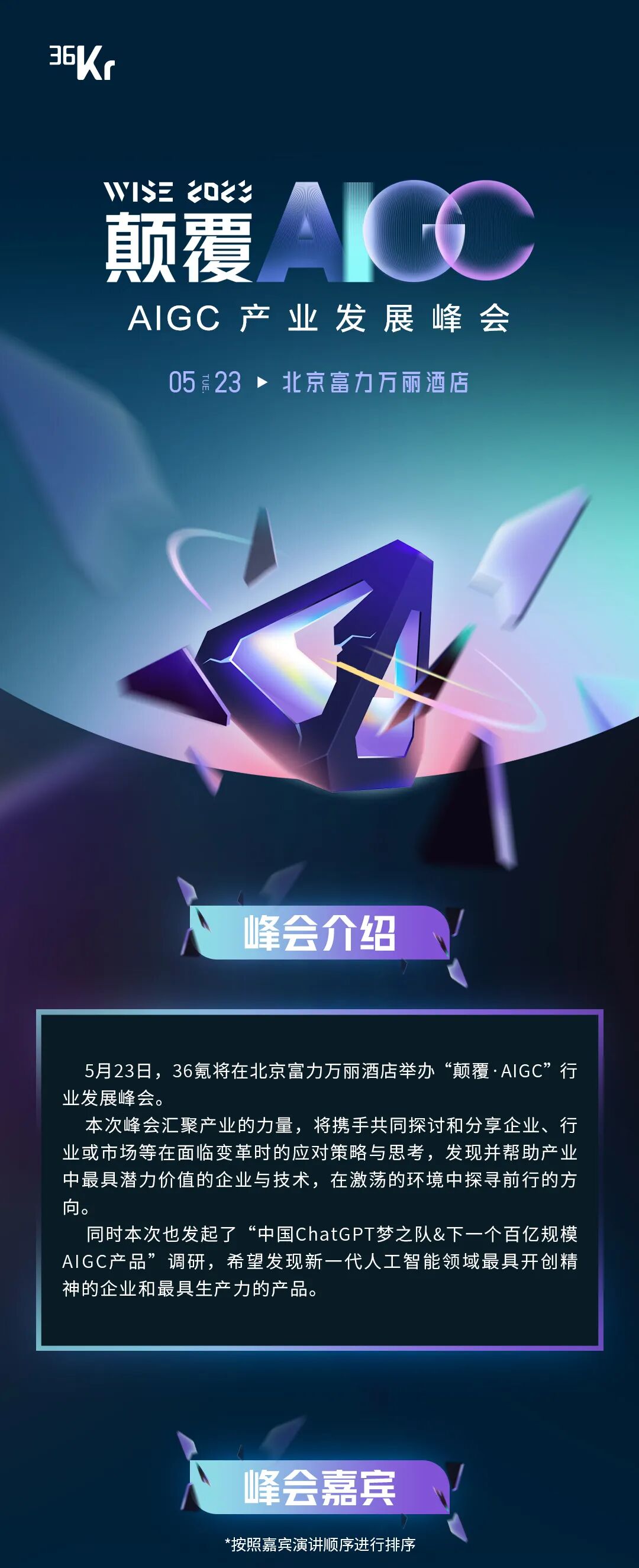 5月23日,36氪“颠覆AIGC”主题产业峰会将在北京举办,广邀全行业从业者,聚焦从应用层到模型层、基础层的全产业链端口,以产业视角把握AIGC发展脉络,探寻新一代技术浪潮下的前行之路,给出当下思考与应对策略。