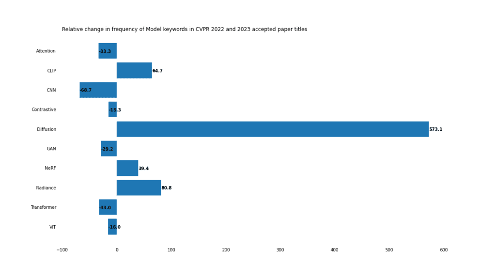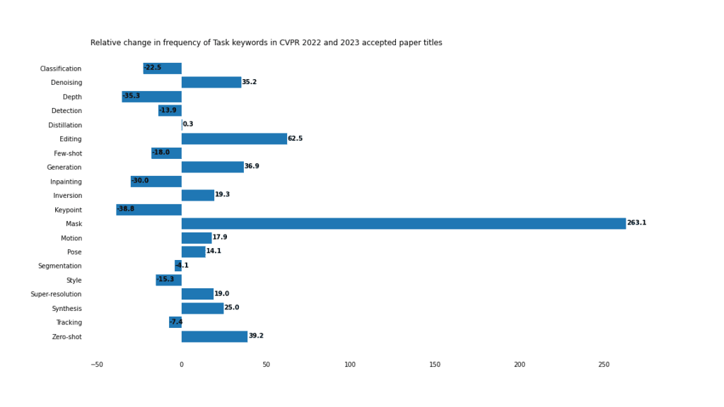 除了2023年的论文标题,我们抓取了2022年所有接受的论文标题。从这两个列表中,我们计算了各种关键词的相对频率,从让大家对什么是上升趋势、什么是下降趋势有更深入的了解。