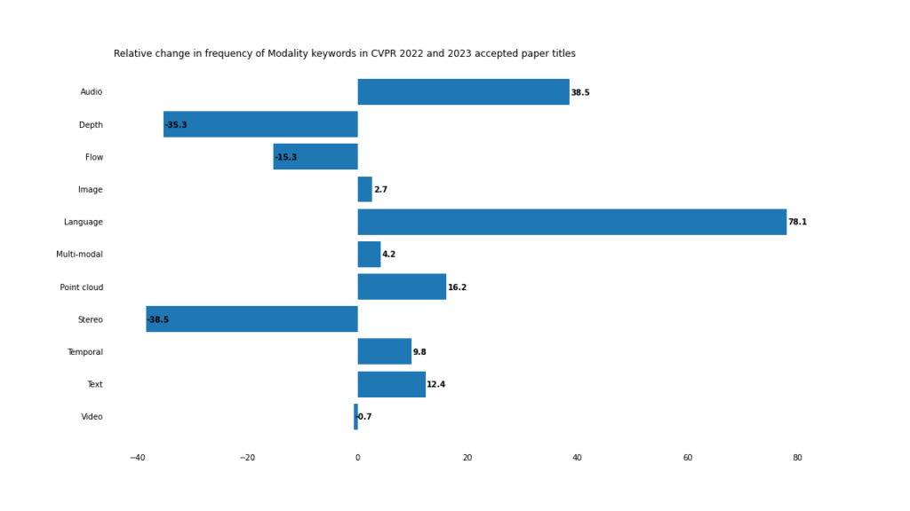 虽然传统计算机视觉关键词如「图像」和「视频」的频率相对保持不变,但「文本」/「语言」和「音频」出现的频率更高。