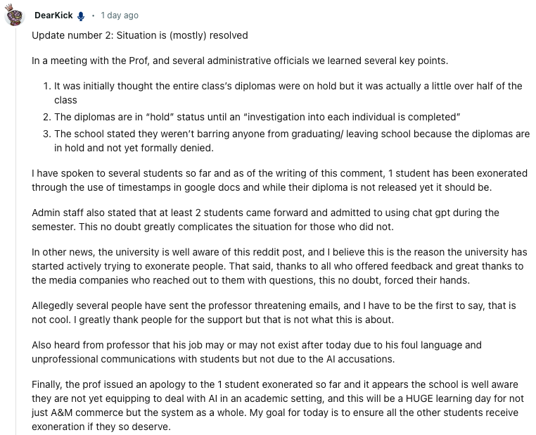 DearKick 称,到目前为止,他已经与几名学生交谈过,截至撰写此评论时,已有 1 名学生通过在谷歌文档中编辑的时间而被免除嫌疑,虽然他们的毕业证还没有发放,但应该发布。
