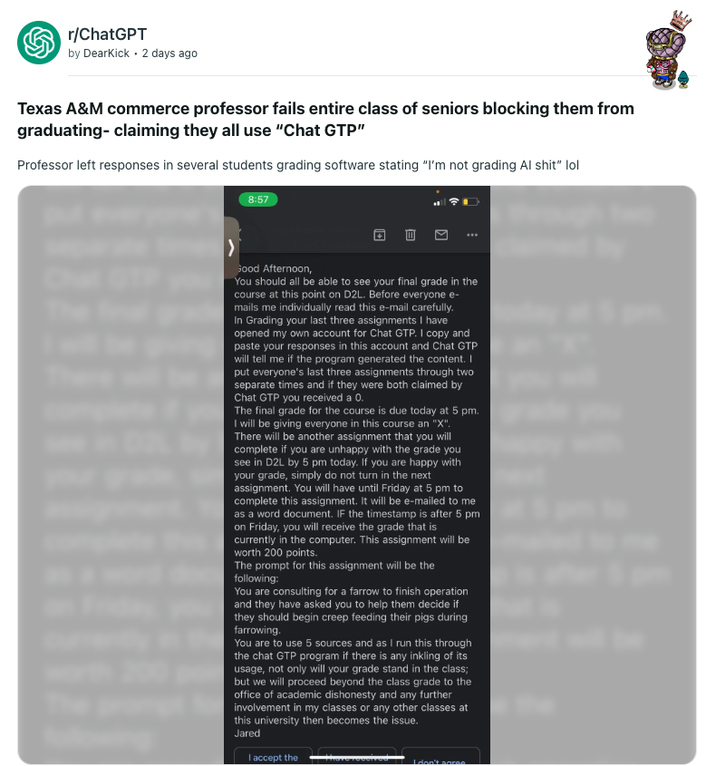 原来是德克萨斯 A&M 大学商业学院(Texas A&M University-Commerce)农业科学和自然资源系教农业课程教授 Jared Mumm 对所有学生发了一封邮件,称他正在使用 AI 工具来评估学生提交的作业是由人类编写的还是计算机生成的。