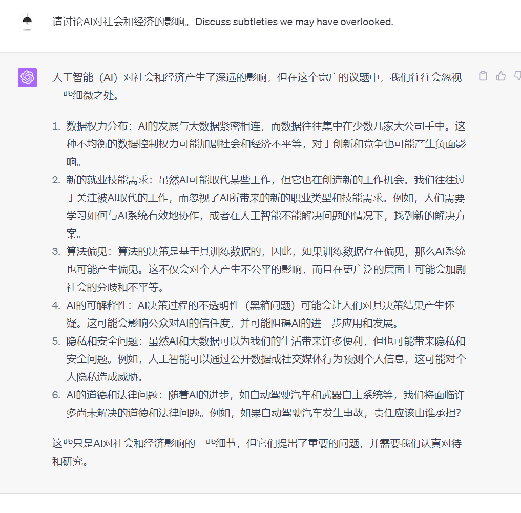 比如对于「请讨论 AI 对社会和经济的影响」这个问题的回答。