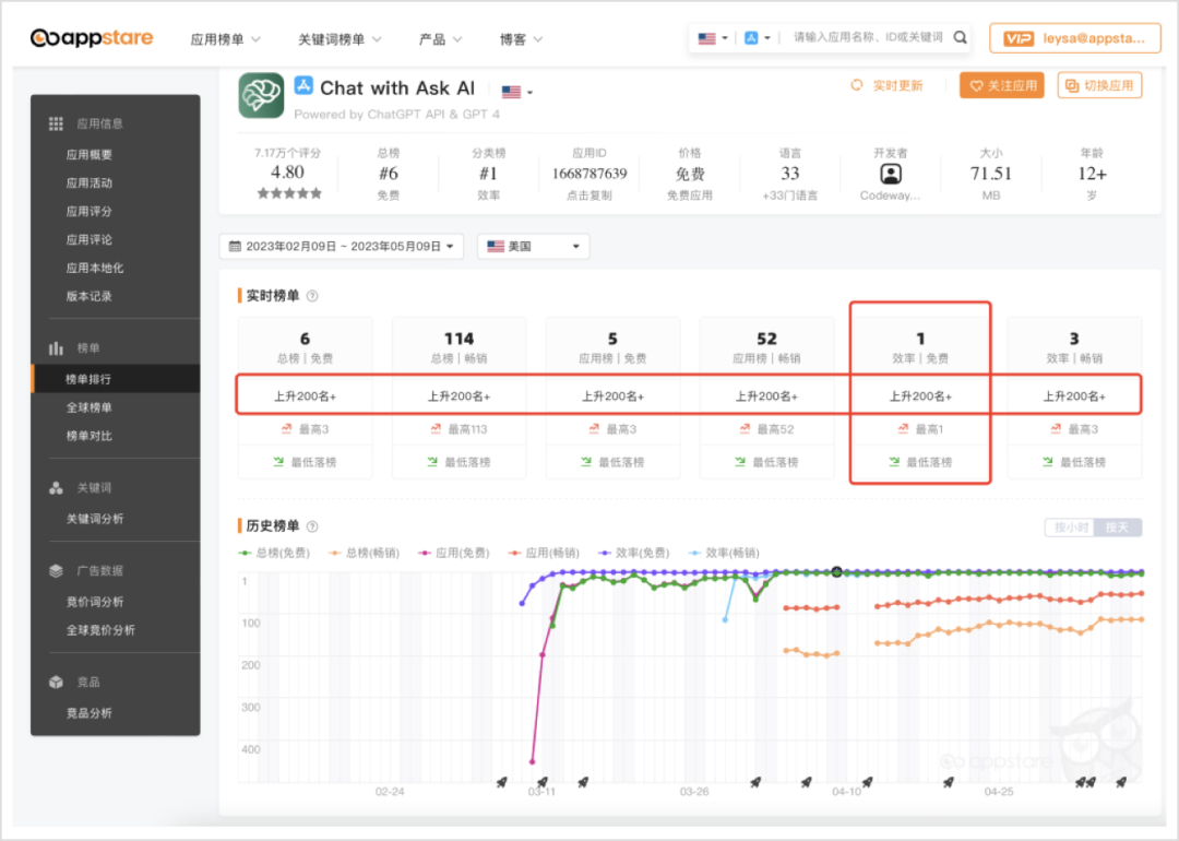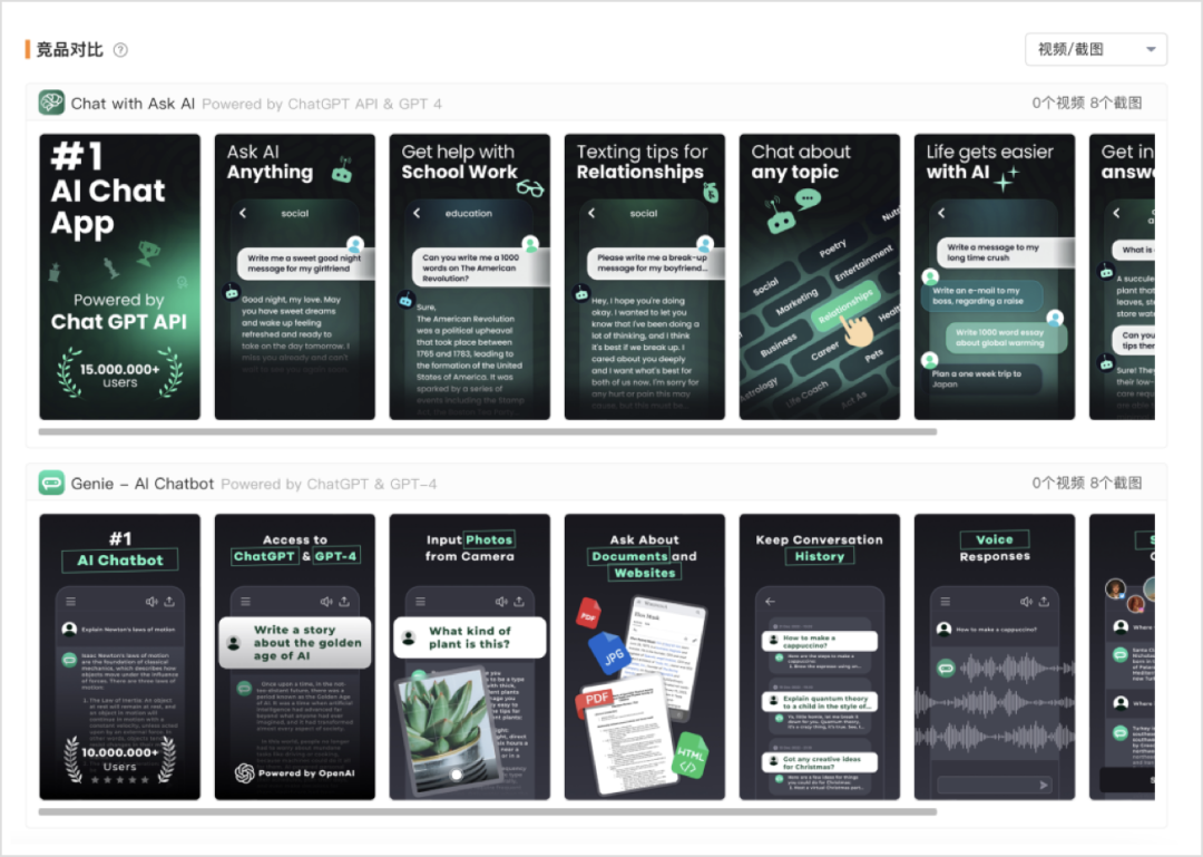 据 AppStare 数据平台监测,2022 年 12 月至 2023 年 4 月期间,App Store 新上架“ChatGPT 相关 app”的数量,从 500 款上涨到了 1400 款左右,是之前的近3倍。随着 AI 工具的不断普及,更多用户发现它的不可替代性,对于相关 app 的需求也会大幅提升,这将为开发者们带来更多机会。近段时间,AppStare 观察到有一款 app,Chat with Ask Ai,目前在 App Store 榜单上,位于包括美国在内 6 个国家的效率榜榜首,在 35 个国家及地区位列效率榜前 10,并成为 AI 聊天类 app 的 3 月全球下载量第 3 名。这款 app 虽然发布时间短,只有 2 个多月,但是榜单上升速度飞快,几乎呈直线增长,且在快速增长期间,有重要的版本更新,包括主副标题、应用截图等元数据修改,同时新的版本整体方向不断向 ChatGPT 4 靠拢。此外,AppStare 还监测到一款同类型 app,Genie-AI Chatbot。通过平台的竞品分析,我们发现这两款 app 不仅覆盖的关键词高度重合、功能展示和应用截图设计相似,而且都选择了 Apple Search Ads(以下简称 ASA)作为自己重要的推广渠道。App Store 是全球范围内拥有高质流量和优秀用户体验的渠道代表,每周用户访问人数达到 6.5 亿¹。搜索是用户在 App Store 上发现 app 的主要方式,70%² 的 App Store 用户通过搜索来发现 app,近 65%² 的下载发生在用户搜索之后,搜索结果广告转化率均值达 60%³。作为在 App Store 上推广 app 的途径, ASA 也因此成为广告主的 “兵家必争之地”。目前,ASA 在海外已经有 4 个广告位,其中搜索结果广告和搜索标签广告已在国内上线,为 app 增加更多的曝光与下载机会。