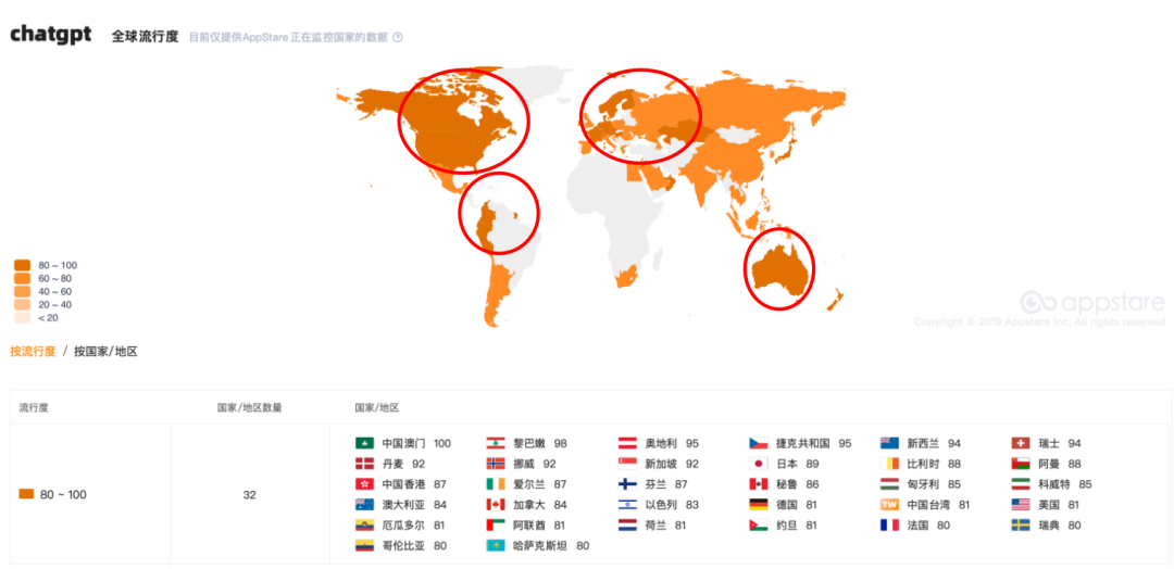 AIGC 火遍全网,AI 技术的革新给行业带来了全新的增长契机。在新机遇不断涌现的背景下,相关类型的 app,又要如何用好 Apple Search Ads,在增长上实现“乘风破浪”呢?5 月 19 日、23 日,由九日论道主办,AppStare、TopOn、智链引擎、飞书深诺联合发起的 AIGC 超级专场圆满落幕。AppStare 市场商务 CiCi 就 AIGC 市场分析、Apple Search Ads 流量突破口等方面向与会开发者分享了一大波干货,一起来回顾一下吧!基于 AppStare 的后台统计工具,关键词“chatgpt”近半年在中国大陆 App Store 的流行度从 54 上升到 88,增长幅度达到 65%,并且截至目前也保持在80左右的高热度。关键词“chatgpt”在中国 App Store 的流行度放眼世界,关键词 chatgpt 在全球的流行度也保持高位。如下图所示,颜色越深表示热度越高,在北美、欧洲、澳洲等等地区,相关关键词均拥有较高的流行度。这也引发了在 App Store 上新一轮围绕 AI 相关产品的流量抢夺战。