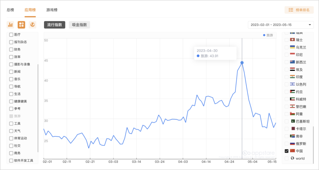 以今年五一为例,旅游类、摄影摄像类、社交类、游戏类等 app 的搜索和下载量有明显的增长。通过 AppStare 的平台分析可见,旅游类产品在节日前一个月就有明显的上升趋势。同时,由于不同产品增长的时间节点不同,建议广告主根据自身产品特点,合理把握自己的营销周期和预算分配。开发者可以提前关注一下六月的季节营销热点,如欧冠决赛、亚洲杯等体育赛事,父亲节、电商节等购物类热点。高考结束后,马上也迎来国内的暑假,游戏类、旅游类、社交类还会有新一轮的流量高峰。