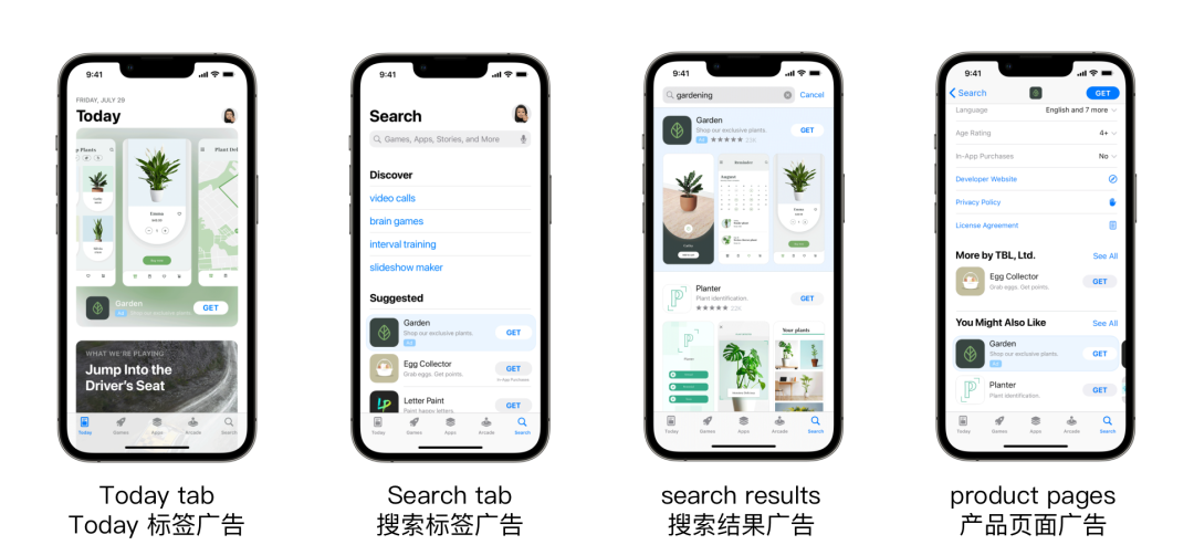 ASA 的四大广告位分别是 Today 标签广告、搜索标签广告、搜索结果广告和产品页面广告,全方位覆盖了用户发现 app 的旅程。