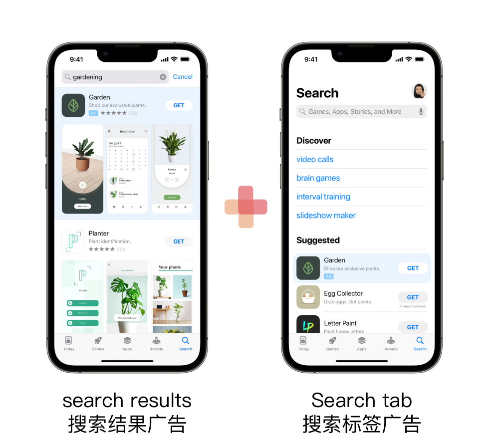 搜索结果广告帮助 app 竞争首位展示,抢夺同类型的产品流量;搜索标签广告通过 CPT (cost-per-tap) 计费模式进行投放,意味着 app 有可能得到更多的免费曝光。