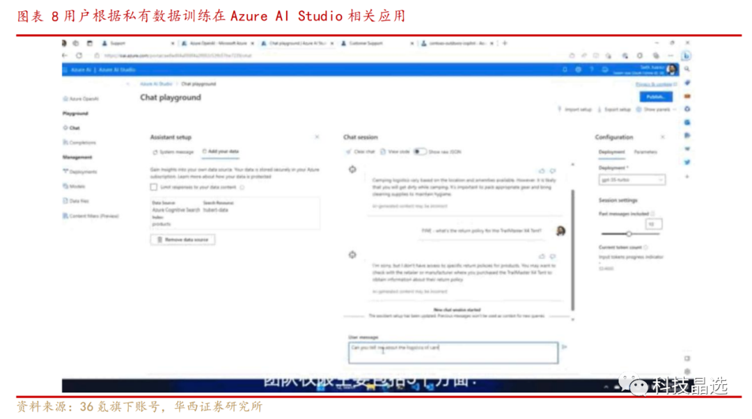 我们认为Azure AI Studio相当于AI时代的生产力工具,可以帮助用户生产AI模型和应用。Azure AI Studio内置了基于OpenAI开发的GPT-4/3.5、ChatGPT、DALL·E 2等模型,开发者可以在其中构建、训练、评估和部署AI模型,并结合私有数据开发AI应用。