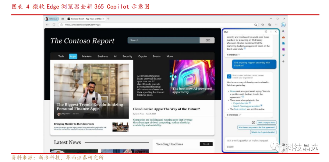 与微软强强联手,开启搜索引擎新篇章。微软在Edge浏览器引入了365Copilot功能。Edge 浏览器的侧边栏会出现 Copilot工具图标,对用户正在浏览的网页内容进行分析,帮助用户生成 Word、Excel等Windows 365文档,或用于撰写Outlook邮件。Edge for Business 商用浏览器支持更多企业管理、安全、隐私和生产力功能,以更好地满足混合办公的需求,面向托管设备的版本现已开启预览,非托管版本将在未来几个月内推出。此外,支持多用户协同工作的 Edge Workspaces 也将在几个月内结束预览,推出正式商用版本。我们认为微软希望与 ChatGpt 携手,将生成式 AI 带入 Edge 浏览器可以帮助 Edge 缩小与 Chrome 的差距,给全球搜索引擎霸主谷歌带来真正的冲击。