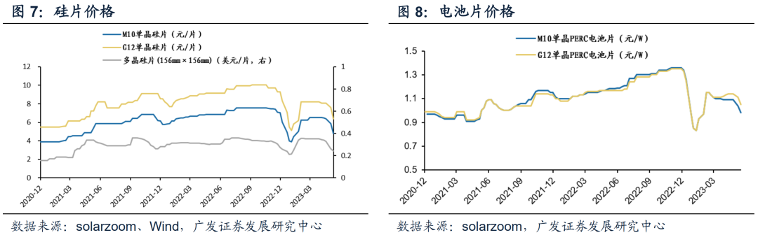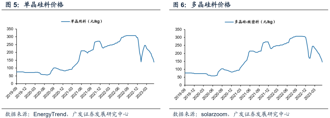根据EnergyTrend数据,截至5月18日,单晶用料价格为138元/kg,周环比下降12.66%;根据solarzoom数据,截至5月18日,多晶硅-致密料价格为145元/kg,周环比下降10.49%。