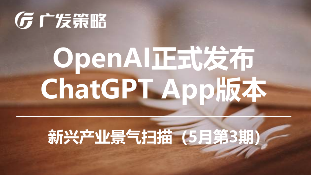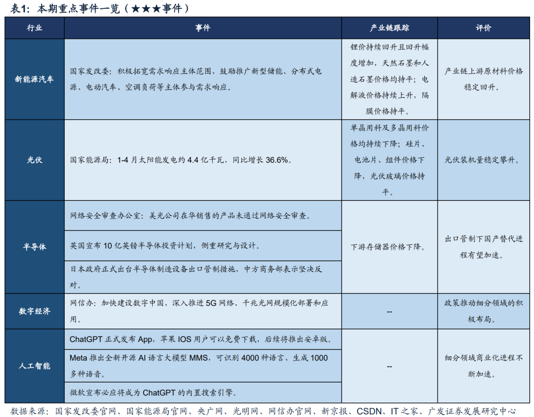 (1)国家发改委:鼓励电动汽车参与电力需求响应;(2)国家能源局:1-4月光伏发电约4.4亿千瓦,同比增长36.6%;(3)美光公司在华销售的产品未通过网络安全审查;(4)网信办:深入推进5G网络、千兆光网规模化部署应用;(5)ChatGPT正式发布App,苹果IOS用户可免费下载。二、新兴产业动态跟踪