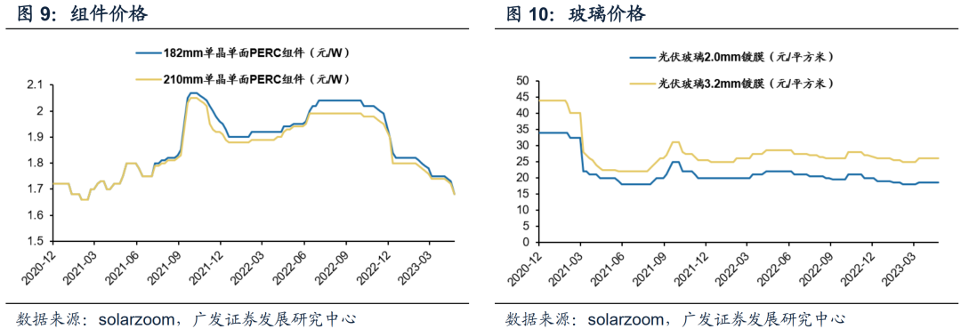 硅片、电池片、组件价格下降,光伏玻璃价格持平。根据solarzoom数据,截至5月18日,多晶硅片价格为0.243美元/片,周环比下降7.60%;M10单晶硅片价格为4.80元/片,周环比下降17.81%;G12单晶硅片价格为6.40元/片,周环比下降15.79%。M10单晶PERC电池片价格为0.98元/W,周环比下降5.77%;G12单晶PERC电池片为1.05元/W,周环比下降5.41%。182mm单晶单面PERC组件价格为1.68元/W,周环比下降2.89%;210mm单晶单面PERC组件价格为1.68元/W,周环比下降2.33%。光伏玻璃2.0mm镀膜价格维持18.50元/平方米;光伏玻璃3.2mm镀膜价格维持26.00元/平方米。