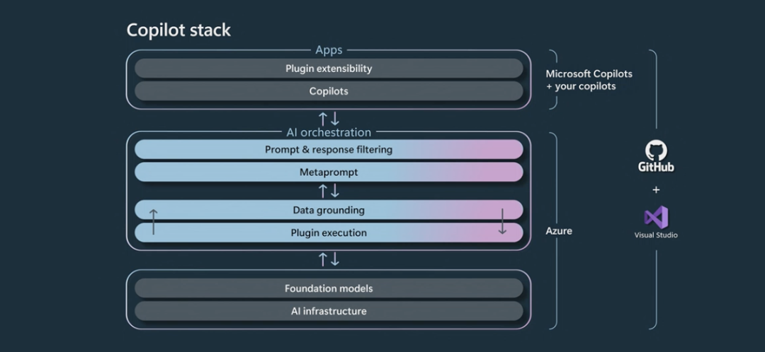 “你必须记住一点,模型不是你的产品,除非你本身就是一家基础设施公司——就像模型本身只是支持产品的基础,其本身什么都不是一样。”会上,微软CTO Kevin Scott将模型视作颠覆性应用程序的土壤,与传统软件开发的起点不同,以AI能力为基座的开发平台,能够将创意落地的门槛大幅降低。Copilot Stack为此,微软推出了AI开发平台Copilot Stack,辅助开发者开发个性化Copilot。Copilot Stack将Copilot开发流程简化成三步:1、选择模型基座,比如通过Azure OpenAI服务调用GPT-4;2、组合AI能力。在这一环节中,开发者需要提供一个“元提示(meta-prompt)”,即对Copilot功能和操作法方式的基本描述;3、访问插件能提供的数据和其他服务。AI开放平台能够让Copilot和插件具有可扩展性。开发者可通过Copilot Stack扩充Copilot的生态。与此同时,开发人员可通过Microsoft Teams Toolkit for Visual Studio Code 和 Visual Studio 创建新插件。为了提高开发效率,微软还在 Windows 11 中推出了开发工具平台Dev Home,用于简化开发人员的工作流程。此外,微软正在研发可辅助插件研发的Copilot或相应功能。比如,Visual Studio Code、GitHub Copilot和GitHub Codespaces能将开发人员创建、调试和部署新插件的过程变得简单,而未来,Azure AI也将上线在私有企业数据上运行和测试插件的功能。