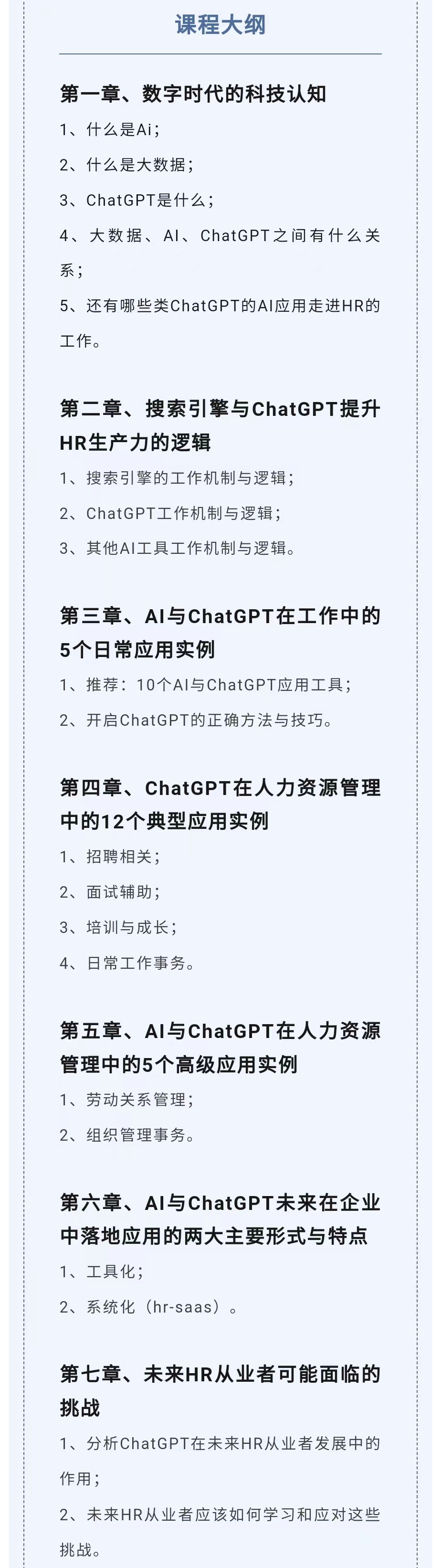 课程以数字时代的科技认知、搜索引擎与ChatGPT提升HR生产力的逻辑、AI与ChatGPT在工作中的5个日常应用实例、ChatGPT在人力资源管理中的12个典型应用实例等七个章节,