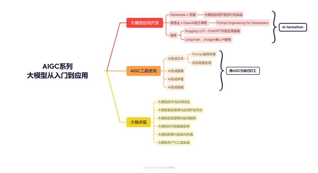 1、五月学习整体规划:https://datawhaler.feishu.cn/docx/NxjFdJgQpoc5qgxTqL5crOElnjc2、AIGC 工具:Prompt 使用指南https://linklearner.com/#/learn/detail/1203、开发教程:ChatGPT 开发指南 https://github.com/datawhalechina/hugging-llm4、Datawhale x 百度:大模型应用开发技巧与实战https://aistudio.baidu.com/aistudio/course/introduce/28611 5、吴恩达 x OpenAI 官方课程:
