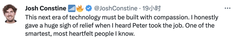 他接着说,“下一个技术时代必须是建立在具备同情心的基础之上的。当我听到Peter接任了这份工作时,老实讲我松了一大口气,他是我所认识的最聪明、最真诚的人之一。”