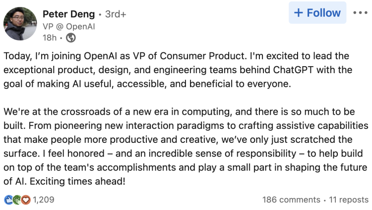 6月1日,ChatGPT新任产品负责人Peter Deng在领英发布动态,宣布正式以“消费者产品副总裁”的身份加入了OpenAI,他写道,“我很高兴能够领导ChatGPT背后杰出的产品、设计和工程团队,目标是让AI对每个人都有用、易获得且有益。”
