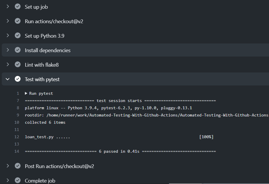 # This workflow will install Python dependencies, run tests and lint with a single version of Python# For more information see: https://help.github.com/actions/language-and-framework-guides/using-python-with-github-actionsname:AutomatedTestingWithPyteston: push: branches:[ main ] jobs: build: runs-on: ubuntu-latest steps:- uses: actions/checkout@v2- name:Set up Python3.9 uses: actions/setup-python@v2with: python-version:3.9- name:Install dependencies run:| python -m pip install --upgrade pip pip install flake8 pytestif[-f requirements.txt ];then pip install -r requirements.txt;fi- name:Lintwith flake8 run:|# stop the build if there are Python syntax errors or undefined names flake8 .--count --select=E9,F63,F7,F82 --show-source --statistics# exit-zero treats all errors as warnings. The GitHub editor is 127 chars wide flake8 .--count --exit-zero --max-complexity=10--max-line-length=127--statistics- name:Testwith pytest run:| pytest