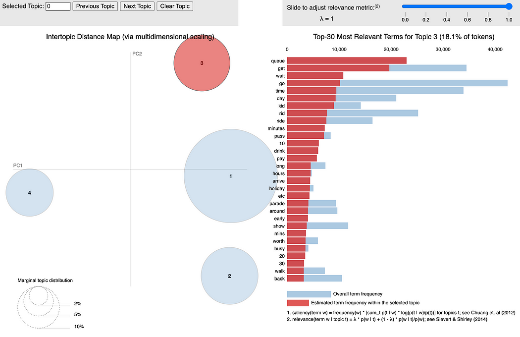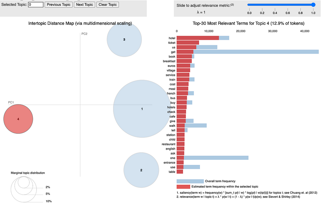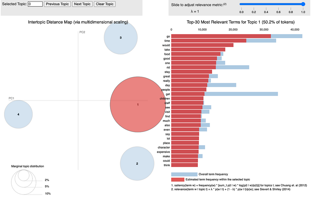 在左侧,我们可以看到每个主题在主题距离图上表示为气泡,这个图是多维缩放在 x 和 y 轴上,如果我们单击一个主题,可视化会自动调整到该特定主题。气泡之间的距离表示主题之间的语义距离,如果气泡重叠,这意味着有很多共同的词。在我们的例子中,主题很好地分离且不重叠。此外,主题气泡的面积表示每个主题的覆盖范围,主题 1 占评价的约 50%,而其他主题则几乎平均分享。