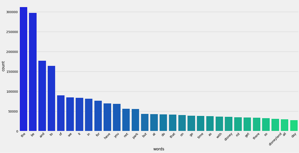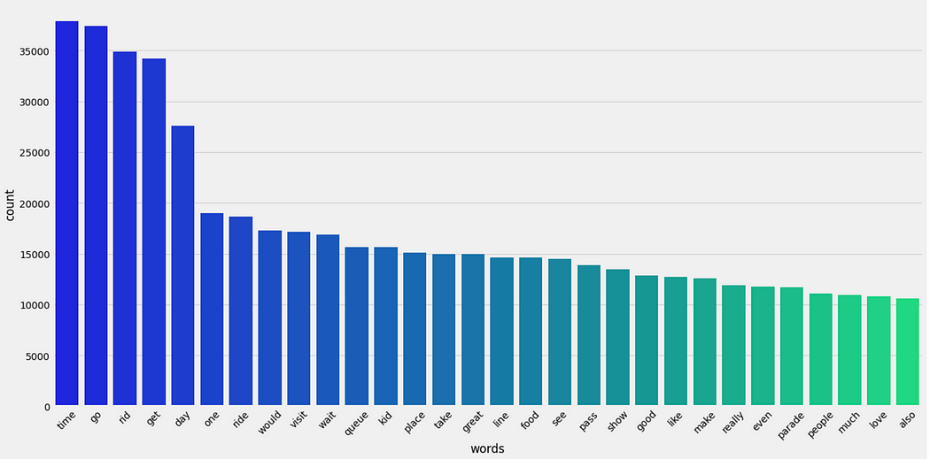 # Load the list of stopwordsnltk.download('stopwords') stopwords_list = stopwords.words('english')stopwords_list.extend(['park','disney','disneyland']) reviews['Review_Clean_List']=[[word for word in line if word notin stopwords_list]for line in reviews['Review_Clean_List']]reviews['Review_Clean']= list(map(text_as_string, reviews['Review_Clean_List'])) # Join all word corpusreview_words =','.join(list(reviews['Review_Clean'].values)) # Count and find the 30 most frequentCounter=Counter(review_words.split())most_frequent =Counter.most_common(30) # Bar plot of frequent wordsfig = plt.figure(1, figsize =(20,10))_ = pd.DataFrame(most_frequent, columns=("words","count"))sns.barplot(x ='words', y ='count', data = _, palette ='winter')plt.xticks(rotation=45);