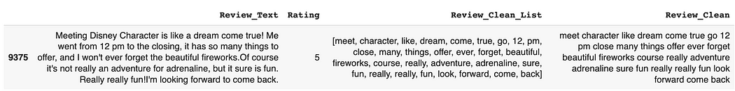 def to_string(text):# Convert list to string text =' '.join(map(str, text)) return text # Create a list of review by applying text_preprocessing functionreviews['Review_Clean_List']= list(map(text_preprocessing, reviews.Review_Text)) # Return to string with to_string functionreviews['Review_Clean']= list(map(to_string, reviews['Review_Clean_List']))